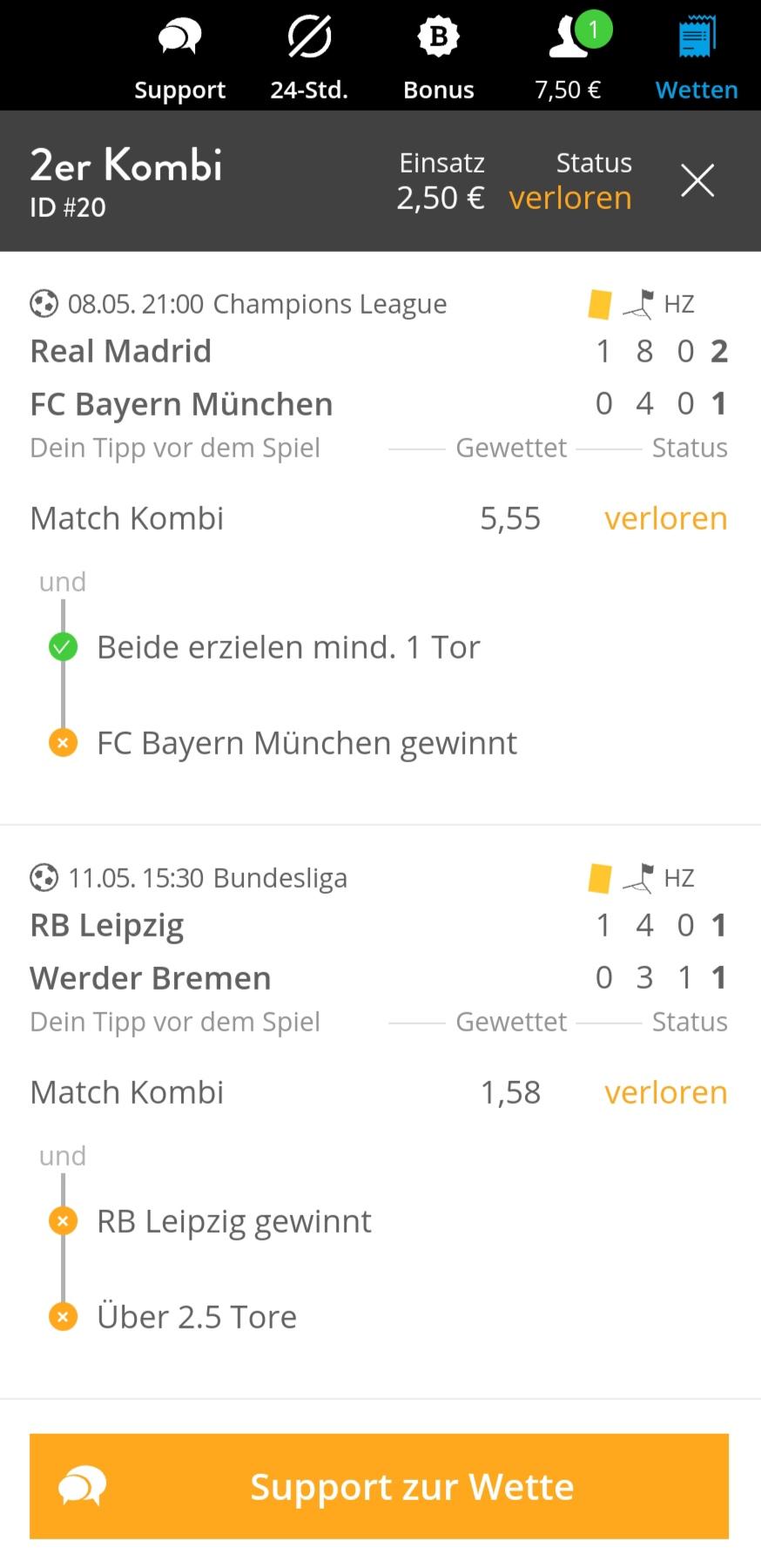 Mit unserer verbesserten Darstellung unter "Meine Wetten" behältst du den Überblick darüber, welche Wetten du innerhalb deiner Match Kombi gewonnen und welche du verloren hast.