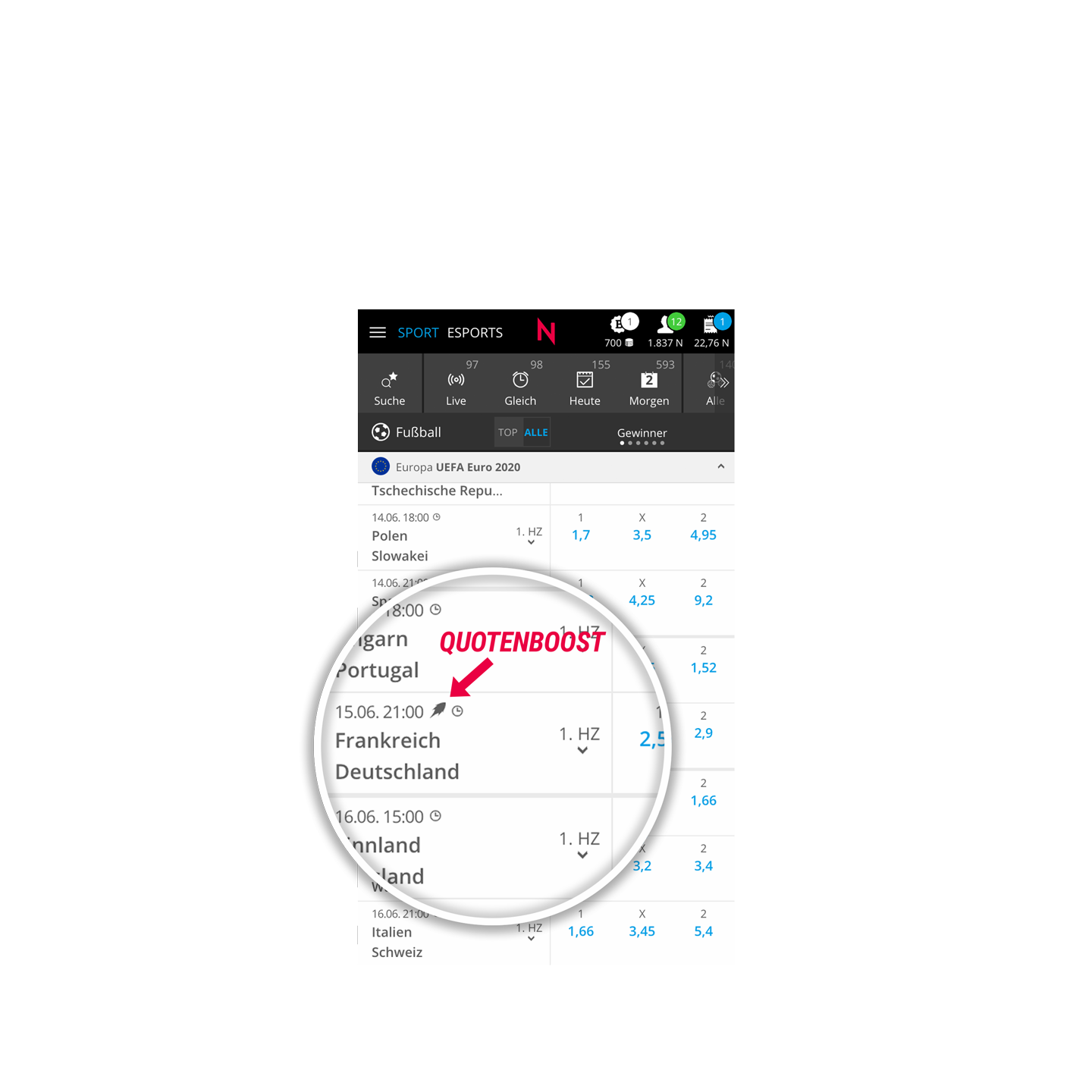 Only at NEO.bet: odds boosts now also for matches already in progress. Cashout feature fully usable.