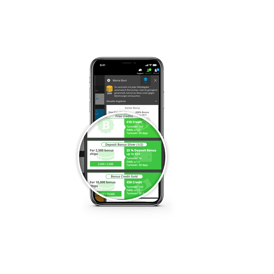 Bonuksen vaihdoissa näet kuinka monta bonus-chippiä olet jo kerännyt. Täällä voit vaihtaa chippisi ilmaiseksi pelirahaksi tai talletusbonuksiksi. 2 500 chipillä saat 10 € pelirahaa seuraavaa vetoasi varten tai 25% 50 €:n talletuksesta. Kerää, muuta rahaksi ja voita.